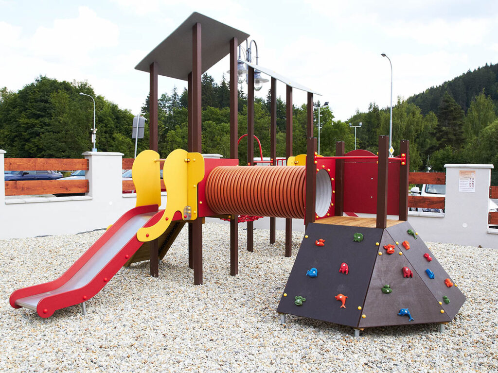 - Venkovní dětské hřiště s dominantní lanovou pyramidou, co u dětí boduje na plné čáře.