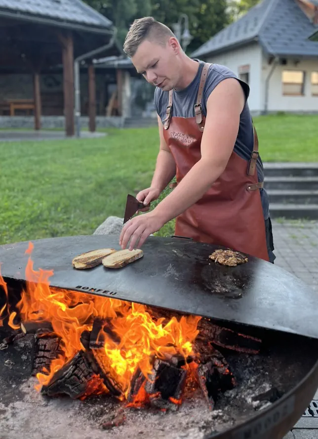 Živaňská z krbuNutno objednat 24 hodin předem Kořeněná vepřová krkovička s uzeným masem, cibulí, kápií a brambory připravovaná v krbu na bukovém dřevě. Připravuje se pouze na objednávku. Objednávka musí být jeden den předem, minimální množství je 20 porcí. |